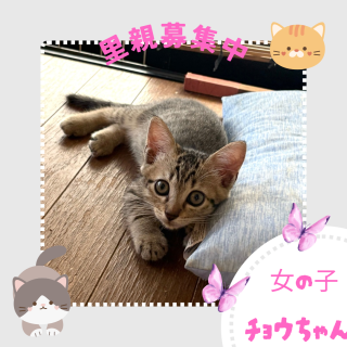 人が作業をしていると眠い顔をしながらでもニャーと高い声を出しながら様子を見にきてく れることも。チュールと猫じゃらしとお昼寝が大好き。大福くんとは兄妹。